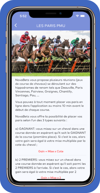 Pariez sur vos chevaux favoris à travers une dizaine de courses par jour: GAGNANT, 2-PREMIERS, 3-PREMIERS